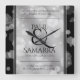 Célébrez le 10e anniversaire de mariage en étain** avec cette horloge acrylique commémorative! L'élégante lettrage noir serif avec des confettis hexagonaux sur un arrière - plan en feuille d'étain bordé de barres noires ajoute une touche mémorable pour cette occasion spéciale et cette étape importante. Customisez avec les noms des couples, les dates du mariage et les messages de félicitations. ** L'effet d'étain est simulé ; aucune étain n'est utilisée dans la fabrication de ce produit. Design © W.H. Sim. Voir plus sur zazzle.com/expressionsoccasions