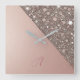 Featuring a brushed rose gold shimmer design with sparkling glitter accents and a customizable first letter monogram in flowing script, this stunning wall clock is the perfect addition for a birthday gift, home decor, bridal suite, wedding decor, or as a cherished keepsake for the bride-to-be.