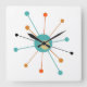 Cette horloge moderne colorée du milieu du siècle présente une starburst atomique en bleu turquoise, deux tons orange et noir. Si amusant à ajouter à votre mur !