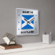 Un design qui présente un carré en faux argent, qui a été conçu pour ressembler à l'intérieur a été chanfreiné. Au centre du carré se trouve le drapeau écossais. Autour de la carré, on trouve le texte "Made In Scotland" ainsi que 6 étoiles décoratives.