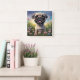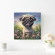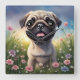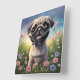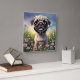 Joli chiot Carlin dans un champ de fleurs.