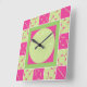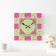 Horloge amusante rétro branchée et branchée avec motif en grille géométrique plaqué dans des lignes modernes propres de carrés en damier alternant formant un Jacquard minimaliste en cool bublegum rose et vert menthe, accentué de cercles de coordination. Un ajout tendance, chic et élégant pour rendre votre maison, dortoir ou bureau lumineux et enjoué.