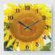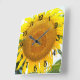 Horloge murale élégante avec des chiffres noirs et des mains qui comprend l'image photo d'une grande tête de tournesol jaune. Un joli design floral ! Utilisez pour décorer un salon, une salle à manger, une cuisine ou toute autre pièce.