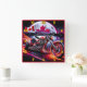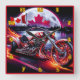 Une moto dynamique avec flammes se promène le long d'un lac serein sous une lune brillante, arborant fièrement le drapeau canadien.