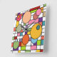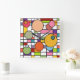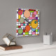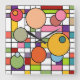 This wall clock has a mid-century modern design of a grid with some rectangles ed in and circles on top in retro colors.