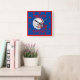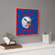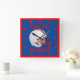 Un casque FootBakk qui est lumineux et coloré. Avec un facemask rouge, et une bande, avec un arrière - plan bleu qui est sur un MUR CARRÉ CLOCK. C'est le TEMPS DU FOOTBALL.