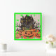 Une vieille maison avec un arbre, un citrouille, et une clôture qui est tout lumineux et coloré qui est sur une horloge CARRÉ.