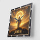 This powerful and moving design captures the theme of Jesus as the Light of the World. The artwork, featured on a square wall clock, displays the figure of Christ standing triumphantly on a rocky mountain summit, overlooking a dramatic landscape of valleys and hills. He is dressed in flowing white robes and has his arms spread wide in a gesture of divine blessing. The scene is illuminated by an intense golden halo or sunburst that radiates light from behind his head, breaking through dramatic clouds. The bold name "JESUS" anchors the lower portion of the design. The core message of Christian faith is quoted from John 8:12: "I am the light of the world." This incredible image provides a spectacular visual representation of faith, serving as an inspiring timepiece and striking centerpiece for any faithful home or sacred space.