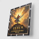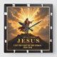 This powerful and moving design captures the theme of Jesus as the Light of the World. The artwork, featured on a square wall clock, displays the figure of Christ standing triumphantly on a rocky mountain summit, overlooking the world below. He is dressed in flowing red and white robes and has his arms spread wide in a gesture of divine blessing. The scene is illuminated by an intense golden sunburst from behind, breaking through dramatic clouds. The title "LIGHT OF THE WORLD" and the bold name "JESUS" reinforce the image. The core message of Christian faith is quoted from John 8:12: "I am the light of the world." This incredible image provides a spectacular visual representation of faith, serving as an inspiring timepiece and striking centerpiece for any faithful home or sacred space.