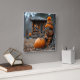 Cet écureuil solitaire est en train de faire un festin secret de noix pendant la saison d'automne de la forêt, un petit citrouille orange avec sa coupe en haut ouvert, révèle encore plus de noix à l'intérieur. Le sol est recouvert de feuilles tombés et de débris. Cette scène simple évoque une atmosphère d'automne chaleureuse, cosy et capricieuse.