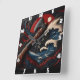 La hache d'un pompier puissant est en vedette, fusionnant avec les vagues féroces et les vents tourbillonnants. Les couleurs vives et les détails complexes créent un contraste évocateur avec un soleil rouge audacieux, incarnant la bravoure et le choc avec la fureur de la nature.