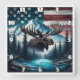 Un orignal trône fièrement au milieu des montagnes et des pins, avec un drapeau américain et une rivière qui rehaussent le magnifique paysage naturel.