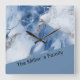 Une horloge murale carré en bleu foncé, blanc et bleu clair couleur encre liquide marbré. Le design est un design romantique et élégant onirique, avec des traces d'or et d'argent comme la brise marine côtière qui brille. Il ressemble à une texture de pierre marmor abstraite et à de la lave fluide en même temps. Vous pouvez customiser l'horloge murale avec votre touche personnelle comme votre nom ou monogrammes. Ce design s'adapte parfaitement aux maisons côtières et fait entrer la brise dans votre chambre.