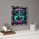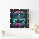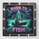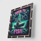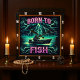Cette oeuvre présente un pêcheur sans peur dans un bateau, bravant une tempête spectaculaire et magnifiquement colorée sur un lac. Le style graphique audacieux et les couleurs frappantes des violets, des teals et des roses font éclater la scène avec énergie. Le design est une ode au dévouement des pêcheurs de partout. L'expression "NÉE AU POISSON" est écrite dans un rose stylisé. Toute la scène est encadrée par des poissons et des feuillages brillants et décoratifs, donnant à l'oeuvre une sensation puissante et énergique.