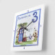 A drawing of a house front door and parked bicycle, states the number 3 and welcome in French or Bienvenue, to our house.