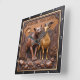 This dramatic square wall clock features a highly dimensional, close-up illustration of a brown panther (or leopard) and a white, happy goat standing side-by-side. The entire design is rendered in muted brown, tan, and dark leather-like tones, strongly suggesting a deep sculpted relief or Sculpted Leather Look. The panther has textured spots and is positioned on the left, while the goat is on the right, smiling with large horns. The background features detailed rocky terrain and stylized foliage carved behind the animals, with heavy texture throughout. The entire foreground is textured, resembling carved rocks and ground cover. The large, three-dimensional embossed text "BESTIES FOR LIFE" is carved across the top center in a bold, golden serif font. The clock face features a simple clock face border with large, white, numbered tick marks (1 to 12) integrated into the outer frame. The artwork is surrounded by a thick, dark brown decorative border that resembles a black wood frame.