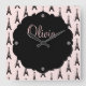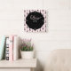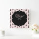 Chic wall clock feobjets a pink and black eiffel tower pattern and can be personalized with your name or message.