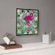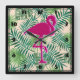 Une horloge carré avec un motif feuille vert tropical. Une illustration de flamand rose apporte une touche de fantaisie.