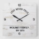 Créez une horloge murale familiale personnalisée avec les mots "Love Never Fails" avec une conception rustique en planches de bois de campagne L'échantillon est montré dans le carré de 10,75 pouces sur la page de commande.