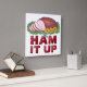 Présente une illustration originale d'un jambon de vacances en tranches vitré sur un plateau, entouré d'ananas. HAM IT UP est imprimé dans une police marron amusant. Ne vois-tu pas ce que tu cherches ? Vous avez besoin d'aide pour la personnalisation ? Contactez Rebecca pour avoir quelque chose conçu pour vous.