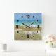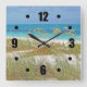 CETTE HORLOGE MURALE DE CARRÉ COMPORTE UNE SCÈNE QUI DES TRANSPORTS VOUS À LA PLAGE AVEC DE L'EAU SON SABLE BLANC, HERBE DE ONDULATION DE MER ET D'AQUAMARINE-COLORED SOUS UN CIEL BLEU. GRAND POUR LA MAISON DE PLAGE OU DE LAC !
