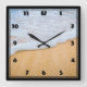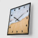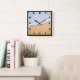 Une horloge avec la photo d'une plage de sable brun doré au surf mousse blanc.