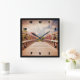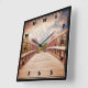 Une pendule surmontée d'un pont en bois pittoresque qui mène à un chemin entouré d'arbres forestiers changeant de couleur.