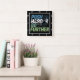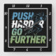 Cette horloge murale noire présente le texte de motivation "PUSH HARDER GO FURTHER" empilé verticalement dans une police audacieuse, légèrement en détresse avec des dégradés de couleur bleu et vert. Une silhouette d'un coureur, qui semble être un individu à la peau claire, en mouvement est placée à droite du texte, transmettant vitesse et progrès. La conception encourage la persévérance dans l'atteinte des objectifs.