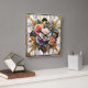 Un agencement détaillé de roses est magnifiquement conçu, avec des tons rose, blanc et violet, entouré de feuilles dorés ornés et un cadre élégant.