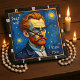 This image presents a vibrant and expressive artwork featuring a portrait of a man with fiery red hair and beard, and striking blue eyes. He is depicted wearing a dark blue coat over a white collared shirt. The background is a swirling, textured night sky filled with luminous yellow stars and celestial bodies, evoking a sense of cosmic wonder and artistic energy. The golden-yellow field below completes the setting. Overlaid on this captivating scene, white handwritten-style text reads "Dear GOD" in the upper left and "I trust You!" in the lower right. The piece beautifully combines a distinct artistic style with a profound message of faith.