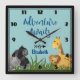 Horloge carré sur le thème du safari. Illustration aquarelle avec gorille, hippo, lion et girafe accrochée au milieu des herbes vertes. La typographie dit Adventure Awaits mignon et fantasque cadeau parfait pour un enfant.