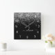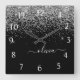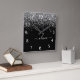 Parties scintillant Argent et Noir Étincelle Script Monogramme Nom Horloge. Cela rend le cadeau parfait pour 16 ans, mariage, douche nuptiale, anniversaire, baby shower ou bachelorette pour quelqu'un qui aime le luxe glam et les styles chic.