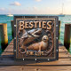 This highly dimensional square wall clock features a bold illustration of a large gray shark with an open mouth and a happy, spotted tan seal swimming together. The entire design is rendered in muted brown, gold, and dark gray tones, strongly suggesting a deep carved relief or Engraved Wood Look, resembling sculpted marine elements. The shark is positioned behind the seal, creating a playful contrast between the fearsome predator and the cheerful, smiling seal. They are framed by an elaborate wreath of swirling, dark brown vines and bubbles carved into the perimeter. The carving style gives the entire image a strong three-dimensional, sculpted quality. The large, three-dimensional embossed text "BESTIES FOR LIFE" is carved across the top and bottom in a bold, golden serif font. The clock face features a simple clock face border with large, white, numbered tick marks (1 to 12) integrated into the outer frame. The artwork is surrounded by a thick, dark brown decorative border that resembles a black wood frame.