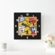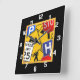 Cette horloge unique comporte un collage lumineux et coloré de signalisation jaune, rouge, et blanche, y compris un signe d'arrêt et un signe de limitation de vitesse. L'image carrée est encadrée en or, et placée sur un arrière - plan noir dramatique. Les nombres blancs rendent l'horloge facile à lire.