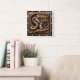 This dramatic square wall clock features a highly dimensional, close-up illustration of a coiled tan and brown snake and a small, pale rat standing next to each other. The entire design is rendered in muted brown, tan, and dark wood tones, strongly suggesting a deep carved relief or Engraved Wood Look. The snake has detailed scales, and the rat has textured fur, a long tail, and is looking up. They are framed by a prominent, gnarled tree root structure and stylized small rocks. The background is a dark, rust-brown color with textured wood grain. The large, three-dimensional embossed text "Besties for Life" is carved in a gold-colored serif font across the top. The clock face features a simple clock face border with large, white, numbered tick marks (1 to 12) integrated into the outer frame. The artwork is surrounded by a thick, dark brown decorative border that resembles a black wood frame.