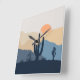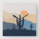 Desert mexicain au lever du soleil illustration avec soleil, montagnes et décoration de cactus en bleu marine, orange, bleu et beige sur arrière - plan gris pastel