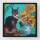 Chat noir expressif, capricieux, tournesols colorés et feuilles verts dans les couleurs jaune et bleu turquoise. Peinture acrylique originale artistique et vibrante sur panneau en bois par Bulgan Lumini (c)