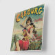Illustration vintage d'une affiche de voyage européenne ou d'une étiquette de bagage pour Cabourg, France par Edouard Elzingre représentant une femme brune en maillot de bain ancien jouant dans les vagues sur la plage. Cabourg est une ville de vacances au bord de l'océan dans la région de Normandie en France.