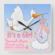 This decorative Green & Orange Musical Decorative Wall Clock Feobjets a blue and pink background with clouds and a stork carrying a baby girl. The text is set up for the baby's name, birthday, and time of birth, add as much information as you would like. Click "Customize" to delete text, change font text color, etc. The background is customizable. Clock numbers can be deleted if you prefer. This It's A Girl Order this custom It's A Girl - Stork Keepsake Wall Clock for your new baby girl's nursery