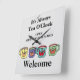 Vous pouvez changer les mots, les couleurs. Les quatre tasses avec les sourires heureux peuvent changer de couleur, il suffit de jouer autour et choisir votre couleur préférée. Le texte peut aussi être modifié instantanément. Pas de supplément. Vous le faites vous-même et obtenez un aperçu instantané, jouer avec les couleurs, ajouter la couleur arrière - plan et plus encore. Texte sur l'affiche : "It's Always Tea O'Clock", heures d'ouverture et bienvenue.