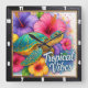 Cette horloge murale carré vibrante présente une tortue colorée, sa coquille dans les tons bleu et or, entourée d'une explosion de fleurs tropicales rose, violet et orange vif. Le texte "Tropical Vibes" est affiché en bonne place, ce qui en fait un garde-temps artistique et joyeux qui apporte une atmosphère insulaire animée à toute pièce.