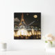 La vue classique du Palais de Chaillot la nuit. La tour se dresse derrière des fontaines illuminées, tandis qu'une lune massive domine.