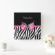 A trendy black and white zebra print clock with a cute pink ribbon bow wrapped like a present. Personalize by adding your name. Perfect present for a teen girly girl !