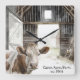 Aquarelle Vache Hereford dans une grange avec un coq sur une échelle de loft de foin. Le texte est modifiable ou peut être supprimé.