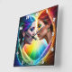 Deux femmes se font face, avec un maquillage et des boucles d'oreilles en arc-en-ciel vibrants, entourées d'un éclat radieux de couleurs.