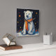 A charming polar bear sits on snowy ground, wearing a bright orange scarf, beneath a dark star-filled sky. Whimsical and cozy, perfect for children's books or festive gift themes.