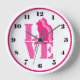 Déclarez votre amour pour les chats avec cette horloge simple et moderne qui a un dessin d'un chat rose sombre assis, en silhouette, avec des ombres roses derrière. Le chat forme le "O" du mot LOVE qui est écrit en gros pochoirs roses. L'horloge a un arrière - plan blanc, des chiffres noirs et une bordure rose foncé coordonnant.