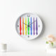 Ce moderne rond, horloge, avec une bordure en bois, a un design simple et élégant de pinceaux aux couleurs arc-en-ciel (rouge, orange, jaune, vert, bleu, indigo et violet), avec seulement quatre numéros ; 12, 3, 6 et 9. Les chiffres sont noirs et le cadran est blanc. Il aurait l'air bien dans une salle artisanale, sur un mur d'une salle d'art, ou dans un cadre moderne.