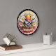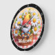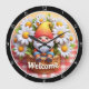 Cette charmante horloge ronde présente un gnome adorable assis dans un panier tressé rempli de marguerites blanches, le tout sur un fond à carreaux rouges et blancs. Un panneau "Bienvenue" orne le panier, ajoutant une touche amicale. Cette horloge fantaisiste est parfaite pour une cuisine, une nurserie ou comme accent joyeux dans n'importe quelle pièce, apportant une atmosphère délicieuse et invitante.