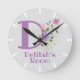 Horloge Des Enfants. Le design présente Monogram & Name avec Fleurs de chaque côté dans un style pastel couleur eau. Le nom de l'exemple est Delilah. Changez le nom comme souhaité pour toute personne ayant un nom commençant par D.
